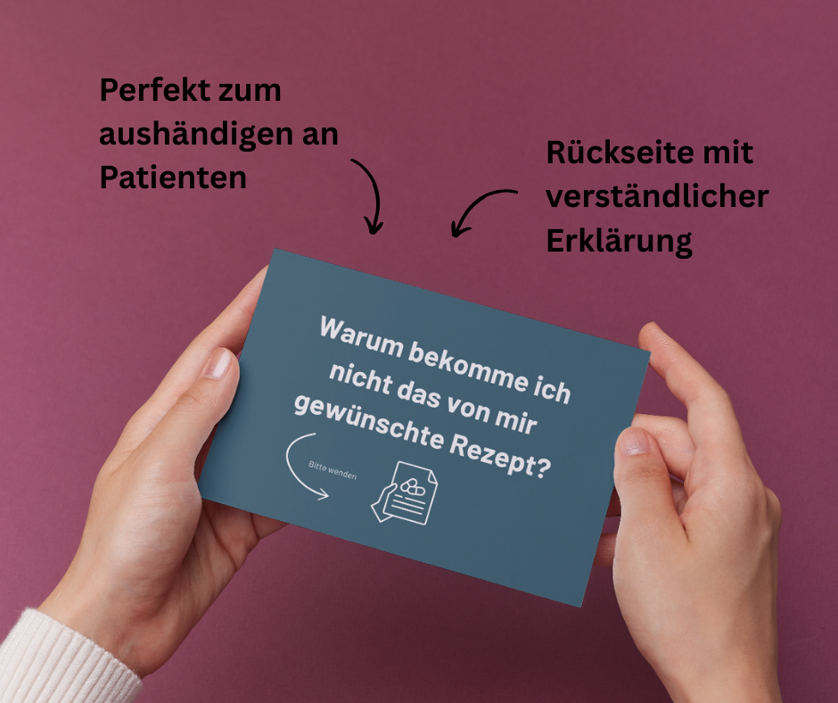 Unsere Patienten-Infokarten schließen genau diese Wissenslücke und beenden frustrierende Gespräche in 3 Sekunden.